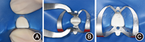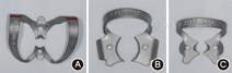 按照适用的牙位,橡皮障夹分为前牙夹、前磨牙夹和磨牙夹3种。前牙夹有两个弓,形似蝴蝶,又称蝴蝶夹(图6A);磨牙夹和前磨牙夹(图6B,图6C)形状相似,长喙夹固定磨牙,短喙夹固定前磨牙。目前橡皮障夹尚无国际统一编号,各产品有其自行的编号体系,刻在弓上。例如:Hygenic(Contène/whaldent)的9号为用于前牙的蝴蝶夹,2号用于前磨牙,8号为上颌磨牙的夹子,7号为下颌磨牙的夹子;号码前的字母W代表无翼夹,号码后的字母A表示弯曲喙。