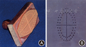 顾名思义用于给橡皮布打孔,以将橡皮布套在拟隔离的牙上。有单一孔径和多孔径打孔器两种,后者可针对各个牙位,通过旋转跕盘,分别打出0.5、1.0、1.5、2.0及2.5 mm共5种直径的孔(图3),多孔径打孔器临床更常用。