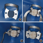 (4)弓法(bow technique):见图11。①将橡皮障夹的弓从橡皮布背面由孔中穿出,使其暴露在外。②翻转橡皮布,露出橡皮障夹的夹臂,用橡皮障夹钳撑开夹子。③直视下将橡皮障夹安放在隔离牙的颈部。④将橡皮布从橡皮障夹上拉下套入隔离牙的牙颈部。