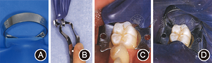 (3)夹优先法(clamp first):见图10。①选择无翼夹,将其固定在隔离牙上。夹上应系上安全绳,安装时将绳末端始终置于口腔外,防止发生橡皮障夹崩脱导致的误吞误吸。②将橡皮布上打好的孔依次套过橡皮障夹的弓、牙冠和橡皮障夹的夹臂,使这些部分暴露在橡皮布上方。③用牙线帮助橡皮布通过邻面接触点。