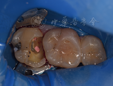 ①如能暴露修复体冠边缘的根面,须将橡皮布和夹子喙部下推、卡抱至此,避免夹在瓷冠表面造成损伤。②增加邻牙隔离固位。③如需对戴冠患牙开髓,为避免因修复体掩盖自然牙原始牙长轴方向而造成的侧穿,可在安放橡皮障前先行开髓,确定根管解剖位置后再上橡皮障。