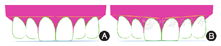 确定牙龈曲线高度后,更细节的美学诊断和设计是围绕牙龈曲线倾斜度进行的。牙龈曲线倾斜度是指上颌中切牙龈缘顶点和上颌尖牙龈缘顶点连线的倾斜角度。对于水平的牙龈曲线,中切牙和侧切牙临床冠的高度较大,更易形成宽长比较小、外形更细长的牙齿,给人大气、豪放之感(图2A)。在切缘位置不变的情况下,有一定倾斜度的牙龈曲线,中切牙和侧切牙临床冠的高度更小,更易形成宽长比较大、外形更短粗的牙齿,给人细腻、柔美之感(图2B)。