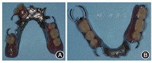 (3)诊治经过:建议基础治疗后行活动义齿修复,患者知情同意。局部麻醉下拔除27、28。1周后复诊拔除47。约1周后15行根管治疗。2周后行牙周洁治及个别龈下刮治。3个月后行修复治疗。用椅旁扫描设备(CEREC,西诺德,德国)进行口内扫描,获得数字化模型(图3)。三维打印制作树脂模型(图4A),在树脂模型上进行铸造钴铬合金支架设计(图4B)。铸造后支架在患者口内试戴,试戴时支架能准确就位,连接体与黏膜贴合,