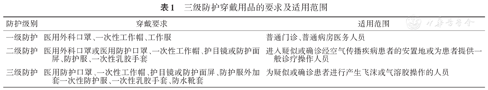 由于2019-nCoV是通过呼吸道飞沫或接触发生传播[5],根据医院感染管理规定,医院感染防护分为三级(表1),根据感染的风险程度,医务工作人员采取不同级别的防护措施[3,8]。