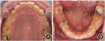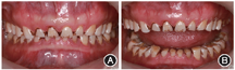 患者前牙重度磨耗口内像 A:全牙列正面咬合像;B:全牙列正面非咬合像
