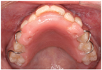 (1)一期矫治:在11、21舌侧窝粘接上颌固定舌刺,纠正不良舌习惯,嘱患者进行舌肌功能训练[3],辅助建立舌体正常功能位置。嘱患者贴口呼吸贴闭唇睡眠,辅以唇肌功能训练[4],纠正口呼吸习惯。矫治1个月的口内像示开
