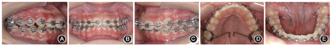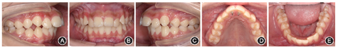 (5)矫治计划:转耳鼻咽喉科会诊,明确呼吸道是否存在异常。耳鼻咽喉科会诊示无明显鼻腔病变,可行正畸治疗。制定以下双期矫治方案。第一期矫治:①粘接上颌固定舌刺,配合舌肌训练,纠正吐舌和异常吞咽习惯[3]。②贴口呼吸贴闭唇睡眠,辅以唇肌功能训练[3, 4],纠正口呼吸习惯。不良口腔习惯纠正后开始二期矫治:①口外弓抑制上颌生长。②上颌横腭杆扩弓2 mm。③口外弓支抗远移13、23,建立尖牙中性关系,上颌间隙用于内收上前牙。④二期矫治及保持阶段嘱患者继续进行口腔肌功能训练,闭唇睡眠,避免不良口腔习惯导致牙齿错位复发。
