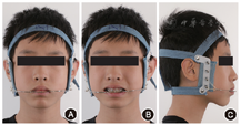 患者矫治9个月时(二期矫治)配戴头帽-口外弓的面像 A:正面像;B:正面微笑像;C:侧面像