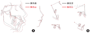 患者矫治前后头影描记重叠图 A:S(蝶鞍点)-N(鼻根点)重叠图;B:矫治前后Ricketts五项重叠图