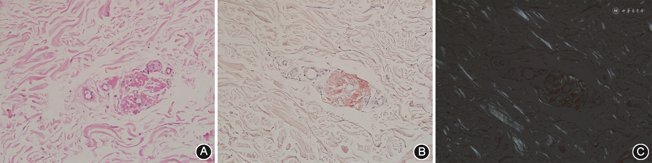 (4)进一步检查:患者舌、肾脏、心脏多器官受损,考虑系统性疾病继发引起,需进一步完善病理学检查,患者年龄较大,肾脏、心脏取活检风险大,且因经济原因拒绝该两项检查,故进一步完善舌、腹部脂肪、骨髓活组织检查。骨髓涂片:骨髓形态偏幼的浆细胞2%。流式细胞术:有核细胞中可见0.15%异常单克隆浆细胞。骨髓活检:考虑浆细胞骨髓瘤。刚果红染色(+)。舌组织活检:鳞状上皮增生,上皮下见少许纤维及横纹肌组织。免疫组织化学染色:Kappa(+),Lambda(+)。免疫荧光:Kappa(++),特殊染色:刚果红(+)(图1)。腹部脂肪活检:真皮内纤维组织增生,皮下脂肪小叶间隔显著增宽;刚果红染色(+),结果提示淀粉样变性。免疫组化:Kappa(+),Lambda(+)。特殊染色:刚果红(+)(图2)。