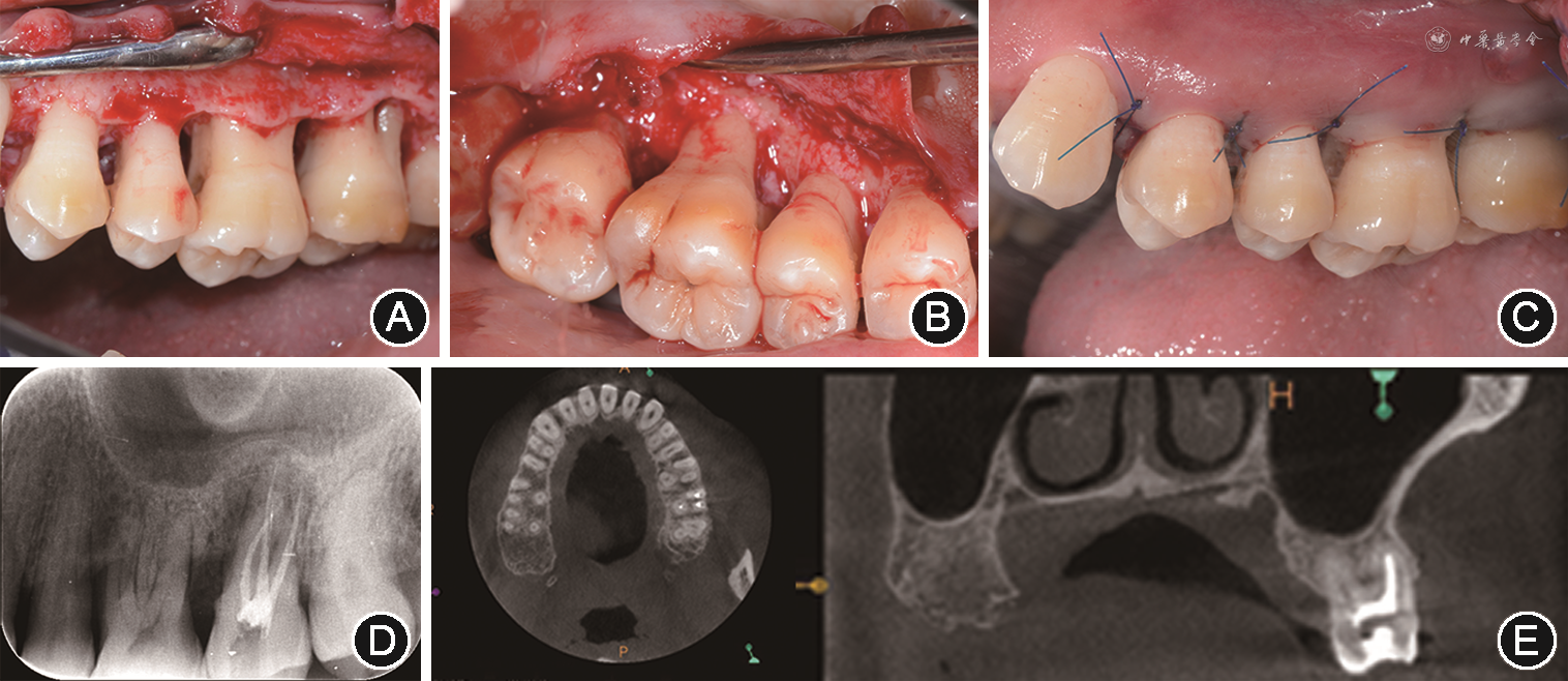 (2)第2阶段:2017年8月至2018年3月行牙周手术治疗。于右上、左上、右下及左下4个区段进行4次牙周手术,每次间隔1个月左右。右上、左上及左下行牙周翻瓣术及骨成形术,右下区段行牙周翻瓣术及46植骨术。左上区段牙周手术前27颊侧窦道仍可见,术中使用手工和超声刮治器彻底清创,可见牙槽骨吸收为水平型,因此进行骨成形术。在牙周翻瓣术后3个月复查时可见窦道完全闭合,探诊深度降至4 mm及以下,术后1年影像学检查显示根尖病变及根分叉病变愈合(图2)。右下区段进行牙周翻瓣术和46植骨术,术中清创后可见近远中2~3壁骨下袋,远中骨袋深5.0 mm,近中骨袋深2.5 mm,骨袋近远中向宽度为3.0 mm,颊侧釉质牙骨质界距离骨嵴顶3.0 mm,舌侧釉质牙骨质界距离骨嵴顶5.0 mm,近远中骨袋中植入植骨材料(Bio-Oss,Geistlich,瑞士)和浓缩生长因子(concentrated growth factors,CGF)膜(Medifuge,Salfident,意大利)。牙龈瓣冠向复位,改良褥式缝合及间断缝合关闭创面。术后1~2周复查显示牙龈组织愈合良好,未见伤口裂开。46植骨术后1年可见牙龈色粉,质地韧,探诊深度3~4 mm。影像学检查可见角形吸收处牙槽骨密度增加,骨硬板形成且连续。治疗疗程为7个月。4次手术后6个月复查,牙周检查大表显示所有位点探诊深度均≤5 mm,探诊出血阳性位点百分比<30%。
