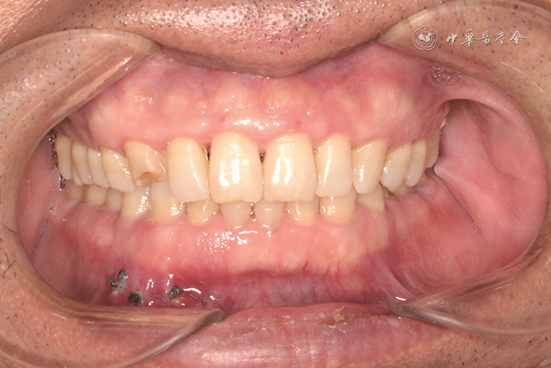 颌骨与牙列同日重建术让患者在手术当天即可戴入义齿,充分体现了“以咬合为导向的修复重建”理念。虽然该理念的实施有助于恢复口颌系统的外形与功能,但为了保障牙种植体的长期存活,以下几点亦需要注意,①为了减少牙种植体的早期负重,临时义齿应该设计成低于咬合平面1~2 mm或轻咬合类型。②为保持口腔清洁,避免术后感染,患者需鼻饲流质2周。③为避免过大
