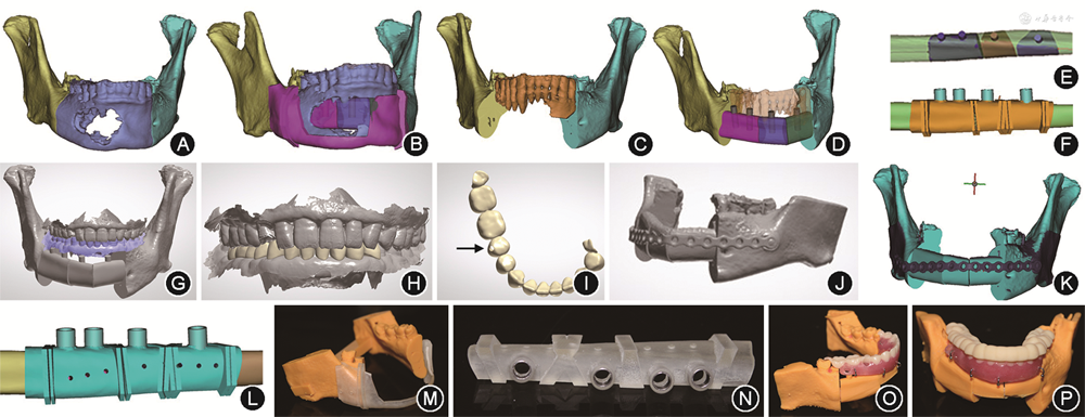 腓骨游离皮瓣已成为重建下颌骨复合或节段性缺损的主要血管化移植物之一[1, 2, 3],其整合牙种植体后有助于义齿修复[4, 5, 6, 7]。但由于腓骨高度和轮廓的限制,以及传统义齿设计和制作复杂且交付时限较长,功能性牙列的及时修复仍是临床一大挑战。下颌骨重建及完整牙列的恢复可能需要多次分期手术,治疗周期长达6~18个月。最近,计算机辅助手术模拟、设计和制作手术导板及快速成型技术的进步克服了复合组织移植固有的许多挑战,促进了下颌重建精度的提高[8]。2013年,Levine等[9]首次描述了使用数字技术模拟手术过程、设计和制作手术导板,同期完成了下颌骨肿瘤切除、血管化腓骨肌皮瓣游离移植、牙种植体植入及临时固定义齿修复。这项技术被称为“jaw in a day”,本团队将其翻译为“颌骨与牙列同日重建术”,并对1例采用该技术治疗的下颌骨肿瘤患者病例进行阐述和讨论。