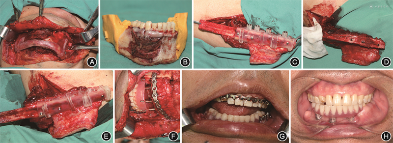 第1组人员就位腓骨-重建板-复合基台-临时义齿复合体。将该复合体就位于下颌骨切除后缺损与咬合夹板中,利用颌骨截骨导板外侧螺孔固定重建板,取下临时固定义齿。微血管吻合(吻合1条动脉和2条静脉),缝合口内创口,暴露复合基台和临时修复基底。口外放置引流管,关闭口外创口。口内安装临时固定义齿,调整咬合关系,流体树脂固定。