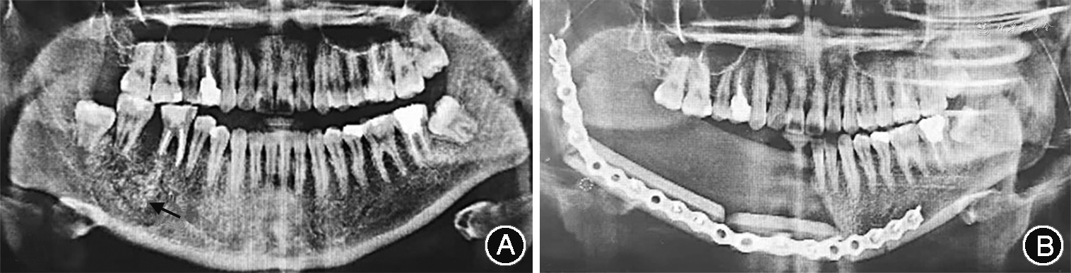 (3)治疗及预后:全身麻醉下手术摘除病灶及节段切除右侧下颌骨骨段,左侧腓骨皮瓣游离移植修复,置入连续钛板(图1B)。患者随诊6个月无复发。