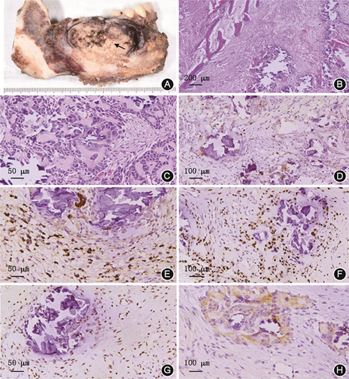 (4)病理诊断:术中切取1块花生瓣大小组织和1块米粒大小组织,粉红色,行冰冻病理检查,术中病理回报:低度恶性骨肿瘤,成骨细胞瘤可能性大,待石蜡切片染色进一步确诊。术后大体标本为9.2 cm×5.5 cm×6.0 cm,带6颗牙,颌骨向唇舌侧膨隆,骨质破坏,界限不清,质地坚实有沙砾感,可有部分软化、出血、坏死或囊性变表现(图2A)。HE染色显示大量异型增生的胞质丰富、胞核浓染的成骨细胞,呈“花边样”排列在类骨质岛边缘,可见病理性核分裂象。肿瘤间质富含血管,有梁状、片状的骨样组织和不同程度的钙盐沉着,并可见散在的多核破骨细胞样细胞和炎性细胞(图2B、2C)。免疫组织化学染色结果显示:细胞角蛋白(-),波形蛋白(+),S100(-),P53(-),Ki67(+),CD68(+),CD38(+),CD138(-),MUM1(-),P63(-),结蛋白(-),癌胚抗原(carcinoembryonic antigen,CEA)(-),HMB-45(-),特异序列AT结合蛋白2(special AT-rich sequence binding protein 2,SATB2)(+),组蛋白H3K36M(+),H3.3G34W(-)。肿瘤细胞Ki67阳性指数约为10%(图2D),CD68和CD38主要表达于多核巨细胞和浆细胞(图2E),成骨细胞胞核呈SATB2阳性表达(图2F),H3K36M表达于成骨细胞、多核巨细胞的细胞核(图2G),肿瘤细胞不表达H3.3G34W(图2H)。最终诊断为成骨细胞瘤。