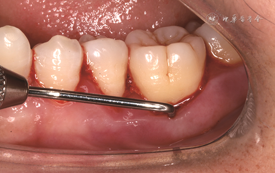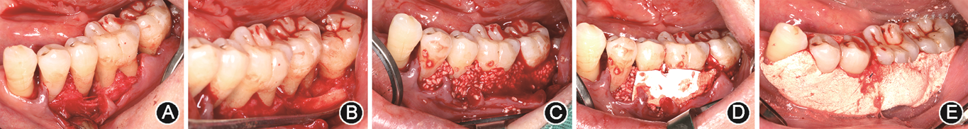 牙周组织再生性手术治疗即通过翻瓣手术清除根面结石及肉芽组织,随后在根分叉区域填入自体骨或人工骨制品,可同期附加生物屏障膜,以促进牙周组织再生的治疗(图5)。