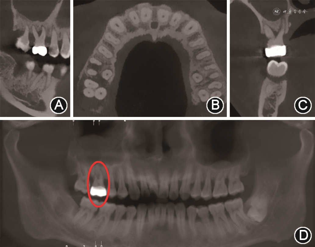 根分叉病变的诊断主要根据探诊和影像学检查。由于根分叉区的解剖结构特点,临床医师需使用特殊弯曲的根分叉探针——Nabers探针进行临床探诊。探诊时将Nabers探针置于根分叉入口冠方牙面上,再将探针以Z字形向根方移动,若探针可探及根分叉凹陷处,则为检测到根分叉病变(图1)。影像学诊断中,X线片对诊断根分叉病变有较大意义(图2),但二维影像学技术受投射角度及组织影像重叠影响,仅可提示根分叉病变的存在可能,必要时需借助锥形束CT进一步完善影像学检查[12, 13](图3)。