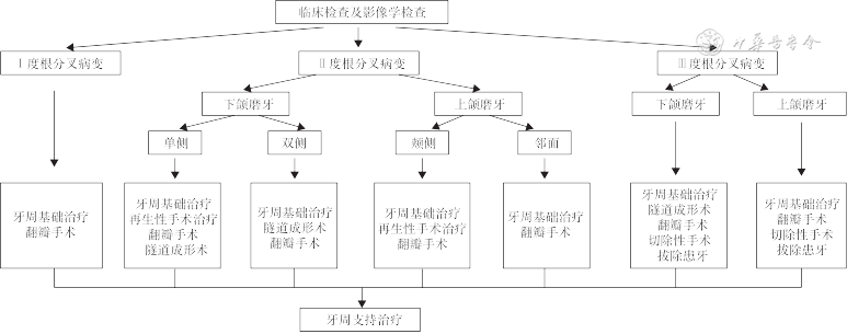 确诊根分叉病变后,需根据详细的临床检查评估根分叉病变的严重程度并制订治疗方案。由于存在刮治器械难以进入根分叉区、根面凹陷等问题,根分叉病变的治疗难度大大增加。根分叉病变的总体治疗原则为彻底清除菌斑,消除炎症,改善根分叉区条件,促进组织再生。具体治疗目标为尽可能彻底清除牙结石及菌斑,消除炎症;对于早期病变,促进一定程度的牙周组织再生;对于晚期病变,通过手术等方法形成有利于患者自我菌斑控制的局部解剖外形以阻止疾病进展。根分叉病变的临床诊疗规范流程见图4,根据治疗目标,磨牙根分叉病变的治疗方法主要为以下3种。