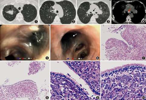 患者女,59岁,退休职工,无吸烟史和粉尘吸入史。2002年因痰涂片结核分枝杆菌阳性给予2HRZE/4HR(H:异烟肼,R:利福平,E:乙胺丁醇,Z:吡嗪酰胺)抗结核治疗,自觉症状明显好转而停药,未能完成疗程。2004年3月因胸闷、胸痛伴阵发性咳嗽再次入院,无发热、盗汗及咯血表现,双肺听诊无明显干湿性啰音,胸部CT可见右上肺病灶未见明显改变,左肺病灶较前明显吸收。ESR、甲胎蛋白及癌胚抗原未见异常,痰涂片找抗酸杆菌阳性(+),给予复发治疗方案抗结核治疗1年,痰涂片结核分枝杆菌转阴,症状明显好转,胸部CT示肺部病灶明显吸收。2007年因咳嗽、咳黄白色痰、痰中带血丝4 d再次住院,无畏寒、发热及胸痛,体重稍有减轻,实验室检查:血常规、结核分枝杆菌IgG抗体、CA-199、CA-125、CA-153及癌胚抗原均在正常范围,痰涂片找抗酸杆菌6次均为阴性,胸部CT双肺病灶呈斑点状致密影及条索样,边缘浅清,但存在肺门增大,纵隔及双侧肺门可见结节样影,部分钙化。考虑陈旧性肺结核给予对症治疗后好转出院。2010年4月29日因咳嗽1个月伴胸闷乏力入院,无畏寒、发热及胸痛,曾有1次痰中带血丝。体检:体温36.5 ℃,呼吸20次/min,口唇无发绀,未见杵状指,胸廓对称,两肺未及明显干湿性啰音,心脏、腹部及四肢体检未见异常。实验室检查:血常规、ESR、CA-199、CA-125、CA-153及癌胚抗原均在正常范围,结核分枝杆菌脂阿拉伯甘露糖(LAM)抗体及相对分子质量为38 000和16 000的抗体均为阴性,痰涂片找抗酸杆菌阴性。心脏超声及心电图未见明显异常。胸部CT可见双肺斑片状密度增高影及结节影,部分病灶内可见点状致密影,右肺上叶可见团块状影,纵隔内及双侧肺门见较多肿大淋巴结,约为27 mm×17 mm,部分病灶内可见点状致密影(图1,图2,图3,图4)。支气管镜检查示:双肺支气管内见大量黑色沉着物,左肺上叶尖后段、左肺下叶及右肺下叶较明显,右肺上叶后段开口管腔堵塞,活检质硬,似软骨,易出血,未见新生物(图5,图6)。涂片找抗酸杆菌3次均为阴性,右上肺尖后段活检病理结果显示:黏膜慢性炎症伴陈旧性出血。结合文献资料和病史,诊断为支气管色素沉着纤维化(图7,图8,图9,图10),给予对症治疗后咳嗽、痰中带血症状好转,出院后患者病情稳定。