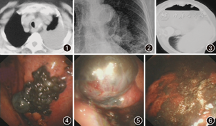 患者女,78岁,主因"气短1年,加重伴胸痛2周"于2011年12月12日入院。病例特点为1年前无诱因出现气短,无明显其他伴随症状,未引起重视。入院前2周因气短加重,伴胸痛、咳嗽及少许白痰,于外院门诊行胸部CT检查提示左肺下叶支气管形态改变,左侧胸膜增厚并软组织肿块形成,左侧胸膜腔少量积液,左肺炎并部分肺不张,行支气管镜检查及X线胸片示:左肺门球形高密度影,边界清晰(图1,图2)。曾于外院行气管镜见镜下未报明显异常,于左下叶背段支气管盲检回报慢性炎症。患者入院前13 d行支气管镜检查发现隆突上5 cm处气管环左侧壁呈外压性改变,长约3 cm,左肺下叶背段外压性改变,于该处盲检病理结果示支气管黏膜-肺组织慢性炎伴间质纤维组织增生,部分肺泡上皮增生活跃。为进一步治疗收入院。发病后无发热、咯血等症,无皮肤黑痣突然增大、瘙痒及渗液。既往有高血压病史2年。体格检查:营养中等,无明显消耗貌,全身皮肤光滑、弹性好,未见黑痣异常改变。全身浅表淋巴结未触及肿大,口唇无发绀,气管无明显移位。左侧呼吸动度减弱、左下肺语颤减弱,左肺背部第8肋下叩诊浊音,呼吸音减低,左肺可闻及少许细小湿性啰音,呼吸音粗糙,双肺未闻及干鸣音。心率86次/min,律齐,各瓣膜听诊区未闻及杂音。腹软,肝、脾肋下未触及,移动性浊音阴性。四肢活动不受限,无杵状指。辅助检查:血常规:白细胞计数5.91×109/L,中性粒细胞为0.56,血红蛋白125 g/L。肝功能检查总蛋白含量为57.4 g/L,白蛋白为34.8 g/L,肾功能、电解质水平及凝血功能等其余实验室检查结果未见明显异常。肺部肿瘤标志物:癌胚抗原(CEA)1.05 ng/ml、铁蛋白含量173.20 μg/L、特异性烯醇化酶(NSE)21.74 ng/ml、CA125 136.1 U/ml、CA21-1 0.85 ng/ml。胸腔穿刺1次为血性胸腔积液,胸腔积液生物化学检查:氯化物101.0 mmol/L、总蛋白44.7 g/L、葡萄糖6.84 mmol/L、乳酸脱氢酶403 U/L、腺苷脱氨酶5.00 U/L。胸腔积液常规:血性浑浊、浆液黏蛋白定性阳性、白细胞计数1.47×109/L、细胞总数130×109/L。胸腔积液病理细胞学检查未查见癌细胞。腹部B超及肾上腺探查未见异常、头颅CT未见异常、心脏彩色多普勒超声未见异常。于12月13日建立人工气胸,人工气胸建立后行胸部CT检查示:胸膜增厚并软组织肿块影(图3)。后进行胸腔镜检查:镜下见下胸壁呈广泛的黑色素沉积样改变,膈顶、叶间裂及肺表面、壁层胸膜多发的孤立或融合的黑色素瘤样增生改变(图4,图5,图6),较大者直径约4 cm,于不同部位取活检共10块,活检时组织松软,伴有少许出血,出血总量约5 ml,局部喷洒蛇毒血凝酶1 U,观察后再未见明显活动性出血,胸腔镜检查后行胸腔闭式引流术等待病理检查结果。病理组织检查行免疫组织化学后诊断恶性黑色素瘤,免疫组织化学结果显示HMD45、S-100蛋白及黑色素瘤-PAN染色均阳性、多巴胺染色呈绿色阳性,含铁血黄素染色阴性。考虑到患者年龄及一般情况较差,给予局部注入顺铂20 mg及A群链球菌封闭胸膜腔治疗,未行全身治疗出院。