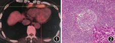 患者男,61岁,因"胸闷、气短5个月"于2012年8月1日以"多浆膜腔积液待查"入我院。患者入院前5个月受凉后出现发热,"抗感染治疗"后体温正常,但逐渐出现胸闷、气短,外院胸部CT检查见左肺舌叶片状影,前纵隔多发肿大淋巴结,心包少量积液;正电子发射计算机断层显像CT(PET/CT)示纵隔、胸骨旁及膈上前群多个淋巴结肿大(最高标准化摄取值为6.6,图1),双侧胸腔少量积液。多次检测胸腔积液中白细胞为(22~24.5)×106/L,单核细胞比例为0.84~0.96,胸腔积液与血清总蛋白比例为0.45~0.58,胸腔积液与血清乳酸脱氢酶(LDH)比例为0.43~0.89,胸腔积液LDH为80~151 U/L,提示介于渗和漏出液之间。胸腔积液病原学检查及病理检查无阳性发现。在当地医院行内科胸腔镜及胸膜活检均未见异常。因不除外结核,加用四联(异烟肼、利福平、乙胺丁醇和吡嗪酰胺)抗结核治疗3个月,随后给予泼尼松60 mg/d,2周后逐渐减量,但症状仍无缓解,故来我院。患者既往体健,每天饮白酒3~4两,40年;吸烟22.5包年,已戒烟4个月。体检:体温36.3 ℃,脉搏86次/min,呼吸21次/min,血压为120/80 mm Hg(1 mm Hg=0.133 kPa),未吸氧时脉搏血氧饱和度为96%,全身浅表淋巴结未及肿大,双下肺呼吸音降低,语颤减弱。双肺未闻及干湿性啰音。无杵状指,心脏及腹部检查未见异常。实验室检查:血、尿、便常规及血生化未见异常,24 h尿蛋白为0.19 g,甲状腺功能未见异常。ESR正常,超敏C反应蛋白为36 mg/L。血及胸腔积液的结核感染T细胞斑点试验检测均在正常范围。血清自身抗体和抗中性粒细胞胞质抗体均阴性。心脏彩色超声检查提示少量心包积液;肘静脉压为13 cm H2O(1 cm H2O=0.098 kPa)。CT肺动脉显像及静脉显像提示心包积液,双侧胸腔积液,心膈角区多发肿大淋巴结,未见肺栓塞征象。腹部B超示肝稍大;门静脉彩超示门静脉(主干内径为1.3 cm)流速偏低。多次复查胸腔积液仍介于渗出和漏出液之间,胸腔积液中腺苷酸脱氢酶、乳酸脱氢酶及淀粉酶均在正常范围。因诊断不明,在全身麻醉下行胸腔镜下心包前肿物切除术,术中发现肿物2块,1块位于右侧心膈脚附近与心包外脂肪融合生长,直径约为5 cm,触之质地较韧。另1块位于左侧心包外脂肪内,大小为4 cm×6 cm,与左侧心包外脂肪融合。切除组织的病原学检查阴性,病理回报:巨淋巴结增生(Castleman,浆细胞型,图2)。免疫组织化学染色CD138、CD38、浆细胞、CD20及CD31阳性,CD21及CD23部分阳性。