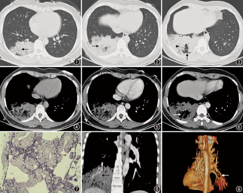 仔细阅读分析高分辨率胸部CT的影像学表现也有助于鉴别诊断。本例患者从影像学表现分析应当属于肺炎型肺腺癌。本例患者CT影像学整体表现为肺段实变伴空泡及蜂窝状影,周围为边缘不清的云絮状阴影,病灶的实质CT值偏低,强化不明显,平扫纵隔窗肺实质CT值25 Hu,增强扫描后CT值38 Hu,增强值13 Hu,强化不明显(图4,图5)。实变影由癌细胞及癌细胞分泌的黏液大部分或完全充填肺泡造成;癌细胞沿肺泡孔及细支气管播散蔓延及继发出血和炎性渗出形成周围的模糊的云絮状阴影。此外,还具有以下影像学特征:(1)癌性充气支气管征:是本病与细菌性炎症及肺栓塞鉴别的要点之一[1];癌细胞沿气道表面生长,造成支气管僵直、狭窄、壁锯齿状或伴支气管腔内毛刺;或由于癌细胞沿肺泡壁生长伴肺泡壁塌陷,导致远端支气管受压迫闭塞,形成充气支气管的截断。本例患者胸部高分辨率CT肺窗显示充气支气管僵直、狭窄,远端支气管截断不能显影(图1,图2)。(2)叶间胸膜膨隆:肿瘤细胞分泌的黏液使肺叶膨胀、叶间裂膨隆,叶间裂膨隆可呈锯齿状或弧形隆起;该征象在大叶性肺炎或肺不张很少见。本例患者胸部高分辨CT肺窗显示右下肺后短叶间裂呈锯齿状隆起(图3),体现肿瘤的浸润和膨胀性生长的特点。(3)空泡征或假性空洞征:未被肿瘤组织占据的含气组织;未闭合或扩张的小支气管;肿瘤细胞沿管壁生长使管腔形成活瓣样阻塞,气体进入肺泡腔但难以排出致肺泡腔过度充气表现为小空泡征或假空洞征。本例患者胸部高分辨CT肺窗显示较多气体密度或低密度空泡征,部分形成囊样空泡或假性空洞样表现(图3),极易和肺脓肿空洞混淆。(4)CT血管征:血管树未被肺癌所侵蚀扭曲及由于大量黏液的产生,实变的肺组织在增强时密度较血管低,从而导致增强扫描时血管纹理显影清晰[2]。本例患者胸部增强CT重建显示右下肺血管走行纹理清晰光滑,未见明显扭曲变形(图8),血管纹和低密度实变形成明显对比,为CT血管征;血管重建显示右下肺肿瘤组织包绕血管,但血管纹理清晰,走行流畅,无扭曲变形(图9)。虽然血管造影征对黏液腺癌诊断有提示作用但不具有特异性,但结合其他影像学特点综合分析对诊断有较大的提示作用。