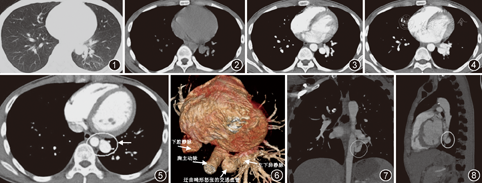 患者男,17岁,因“上呼吸道感染后咳嗽、胸闷15 d”于2014年5月20日入院。患者无发热、咳脓痰及盗汗,无胸痛及咯血,无活动耐力下降,无夜间喘憋或咳嗽加重。无药物食物过敏史,无吸烟史,否认肺结核病史,无吸烟史。外院胸部正侧位片报告示左肺下叶球形病灶,周围见多发卫星灶,考虑肺结核可能性大。入院体检:体温36.6 ℃,血压120/80 mmHg(1 mmHg=0.133 kPa),口唇无发绀,浅表淋巴结无肿大;颈静脉无怒张,胸廓对称,双肺呼吸音粗,未闻及干湿性啰音;心率为72次/min,心律齐,各瓣膜听诊区未闻及杂音;肝脾不大,双下肢无水肿,无杵状指。实验室检查:血常规、凝血常规、肿瘤标记物,G试验、GM试验、PPD试验、降钙素原、ESR、C反应蛋白、新隐球菌抗原检测、痰培养、痰检抗酸杆菌等均无异常。血气分析示:pH值为7.38,PaO2为88 mmHg,PaCO2为73 mmHg,SaO2为97%,AB为25 mmol/L,BB为46 mmol/L,二氧化碳结合力(CO2CP)为26 mmol/L。于2014年5月20日行胸部CT平扫(图1,图2)示左肺炎,左肺下叶占位,建议行CT增强扫描。初步诊断为左肺下叶占位性病变。于2014年5月26日行胸部CT增强扫描,影像科诊断为肺血管畸形(图3,图4)。科内大部分医生诊为肺动静脉瘘(pulmonary arteriovenous fistula, PAVF),少部分医生考虑为肺隔离症,理由是在增强扫描中动脉期畸形血管和降主动脉同时强化,且似乎存在交通支(图5),分析畸形血管血供源于体循环的降主动脉,而非肺动脉。随后组织了影像科、介入科、胸外科进行了院内多学科联合会诊,其中有医生建议行DSA检查,DSA是诊断肺血管畸形的金标准,但为有创检查,有一定的危险性,影像科进行了多层螺旋CT三维血管重建(multislice spiral CT angiography, MSCTA),从各个角度显示畸形血管的空间解剖,血管构成及走向[1](图6、图7、图8),最终诊断为先天性降主动脉肺静脉瘘(congenital descending aorta pulmonary vein fistula, cDAPVF)。