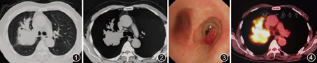 住院后查血常规正常,嗜酸粒细胞计数正常。血清总免疫球蛋白E(IgE)和曲霉特异性免疫球蛋白E均正常。血癌胚抗原84.56 μg/L(正常参考值:0~5 μg/L)、鳞状细胞癌抗原1.8 μg/L(正常参考值:<1.5 μg/L)。痰找结核菌和真菌结果均阴性。1,3–β–D–葡聚糖和曲霉半乳甘露聚糖抗原均正常。支气管镜示右主支气管外侧壁可见息肉样新生物生长(图3)。给予右主支气管新生物行活检,病理示肺鳞癌。全身PET–CT显示右肺上叶不规则肿块影,代谢异常活跃,考虑恶性,伴右侧肺内多发转移,右侧肺门、纵隔多发淋巴结以及胰腺转移(图4)。最终诊断:肺鳞癌,Ⅳ期,T3N2M1。