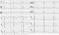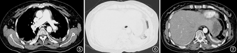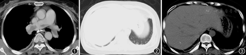 患者女,50岁,因"下肢肿胀疼痛半个月,晕厥、气促4 d,胸痛1 d"于2015年8月30日入院。患者2015年8月11日于外院行"清宫术"后阴道流血,给予"酚磺乙胺"静脉滴注7 d,用药期间右下肢逐渐出现肿胀、疼痛,诊断为"风湿病"并给予消炎镇痛治疗后疼痛减轻,但肿胀无改善。3 d前患者突发晕厥,约10 s后意识恢复,自觉气促、胸闷。下肢彩色多普勒超声检查示:右侧股总、股浅、腘静脉、胫后近段静脉血栓(完全性),诊断"下肢静脉栓塞" 。转至上级医院给予抗凝治疗伊诺肝素钠0.4 ml皮下注射,12 h/次。患者凌晨自觉右侧胸痛,行CT肺动脉造影(CTPA)检查示:双肺动脉主干栓塞,骑跨型肺栓塞,未见明显肺梗死(图1图2图3),为进一步诊治转入我院。既往史:甲状腺功能亢进病史3年,规律服用"甲硫咪唑"治疗,半年前曾经出现右小腿疼痛、稍肿胀自行好转无就医。否认脑血管意外、高血压病史,平素血压约120/70 mmHg(1 mmHg=0.133 kPa),近期无腰椎、眼部手术史,否认服用避孕药、雌孕激素及糖皮质激素史。家族史:母亲及2位妹妹均有下肢深静脉栓塞病史。个人史:无特殊。入院体检:体温36.5 ℃,脉搏80次/min,呼吸24次/min,血压119/71 mmHg,SpO2 93%(吸氧3 L/min),体重61 kg。口唇无发绀,双肺呼吸音清,未闻及干湿性啰音。腹平软,无压痛、反跳痛,肝脾不大,肝肾区无叩击痛。右下肢肿胀,皮温稍高,肌力正常,无感觉功能减退。入院相关检查:血气分析:pH值为7.41,吸氧浓度(FiO2) 30%,PaO2为94.3 mmHg,PaCO2为38.3 mmHg,肺泡动脉氧分压差[P(A-a)O2] 67.9 mmHg;凝血功能:D-二聚体(ELISA法)>10 000 ng/ml,凝血酶原时间 (PT) 14.7 s ,活化部分凝血活酶时间 (APTT) 44.2 s,凝血酶时间(TT) 15.4 s,纤维蛋白原3.30 g/L;心肌损伤相关检查:谷草转氨酶:41.6 U/L,肌酸激酶:15.4 U/L,肌酸激酶MB同工酶:12.0 U/L,乳酸脱氢酶:294.4 U/L,肌钙蛋白(CTnI)0.1 μg/L,肌红蛋白:7.5 μg/L;易栓症相关检查:蛋白S 11%,蛋白C 53%,抗凝血酶Ⅲ 65%。下肢深静脉彩色多普勒超声示:右股总静脉远端至小腿段完全性栓塞,伴丰富的侧支循环,右股总静脉近心端及大隐静脉未见异常团块。心电图未见明显异常(图4)。心脏彩色多普勒超声提示右心增大,三尖瓣反流(轻度),肺动脉高压(轻度),左心室收缩功能未见异常。入院后根据体重给予伊诺肝素钠0.6 ml,1次/12 h皮下注射,第2天患者气促较前加重。体检:呼吸急促,三凹征,呼吸27次/min,脉搏氧饱和度(SpO2)90%(吸氧4 L/min),血压103/62 mmHg。考虑病情较前加重,为避免病情恶化与家属充分沟通并签署同意书后,给予重组人组织纤维蛋白溶酶原激活剂(rt-PA)50 mg,2 h方案溶栓治疗[1]。溶栓过程顺利患者无出血、无不良反应。溶栓后患者气促、胸痛症状明显好转,体检:呼吸22次/min,SpO2 96%(吸氧2 L/min),血压113/71 mmHg。间隔2 h复查APTT减至60 s后给予续贯低分子量肝素(药物、剂量同前)抗凝治疗。溶栓后第2天无明显诱因出现左季肋区疼痛明显,深呼吸加重,腹部无压痛、反跳痛,复查血常规血红蛋白未见明显降低,急查血淀粉酶30 U/L,脂肪酶225 U/L,腹平片排除胃穿孔及肠梗阻。给予对症止痛治疗效果不明显。溶栓后第4天复查胸部CT造影对比溶栓前CT示:(1)双侧肺动脉主干血栓消失、右下肺基底段肺动脉栓塞较前明显改善;(2)左下肺外基底段肺梗死(图5图6图7);腹部增强CT提示:腹部未见异常。考虑溶栓后肺动脉内血栓分解脱落栓塞远端肺动脉,导致肺梗死。继续予以足量低分子量肝素抗凝、吸氧、止痛等对症支持治疗,症状逐渐减轻好转,继续治疗1周后下肢血栓较前减少,9月13日出院,出院给予口服利伐沙班15 mg,2次/d,连续服用3周后改为20 mg,1次/d。