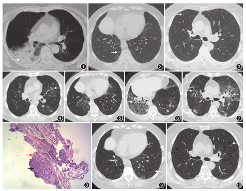 患者女,66岁,主因"间断咳嗽、咳痰9个月余"于2015年9月8日入院,患者9个月前因咳嗽,咳大量白色泡沫痰,无发热、呼吸困难,于外院行胸部CT(图1)示右肺下叶大片实变影、周边弥漫磨玻璃影,查血常规、血癌胚抗原正常,抗感染治疗9 d效果不佳,就诊于我院胸外科,考虑为肺癌,于2015年2月9日行右肺下叶切除及纵隔淋巴结清扫术,术后病理:中央型浸润性黏液腺癌,肿瘤大小约6 cm×6 cm×4.5 cm,支气管及血管断端干净,纵隔及肺门淋巴结未见转移,但肺泡腔内组织细胞聚集,术后分期为ⅡA(T2bN0M0)。患者仍有咳嗽咳痰,但较前好转。患者顾虑化疗相关不良反应,未同意行辅助化疗。4个月前患者胸外科门诊复诊,血癌胚抗原正常,胸部CT(图2,图3)示右肺多发囊性病灶,未予重视。2个月前复查胸部CT(图4,图5),患者肺内囊性病灶及实性结节病灶较前明显增多,肺功能:FEV1占预计值%为116.4%,FEV1/FVC为70.95%,TLC占预计值%为99.4%,DLCO占预计值%为72.8%,支气管镜检查镜下未见明显异常,左B3 BALF白细胞分类:巨噬细胞51%,中性粒细胞7%,淋巴细胞40%,嗜酸粒细胞2%,曲霉半乳甘露糖抗原检测0.168,涂片找抗酸杆菌阴性,细菌、真菌培养均阴性,巨细胞病毒DNA阴性,右B4支气管TBLB病理示肺泡间隔增宽,纤维组织增生,慢性炎症细胞浸润,部分肺泡腔扩张,其内可见较多组织细胞聚集。既往史:发现脂代谢紊乱5年,不吸烟,30年前因卵巢囊肿行子宫及双附件切除。