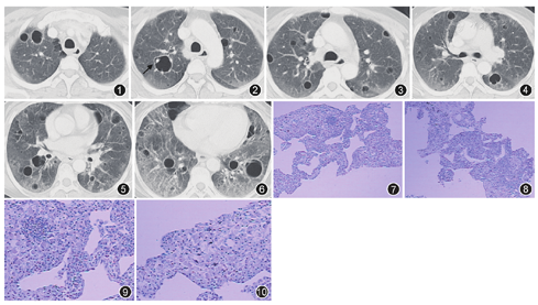 目前为止仅有几篇文献评估了SS患者胸部影像学上的囊腔影的特性及其价值[1,5,6,11]。SS相关的肺部囊腔样改变在HRCT上显示的最具特征性[12]。典型的囊腔样改变包括囊腔形态变化大,囊腔内部结构简单,形成溶解的肺,常常在囊腔边缘附有血管,多分位于双下叶基底或弥漫性分布,常常伴有磨玻璃影像改变和结节影[5],如本例患者所示,当属以浆细胞淋巴细胞性间质性肺炎为病理基础、弥漫多发囊腔样改变为影像学特征的原发性干燥综合征。