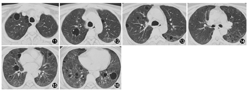 患者为中年女性,工作环境潮湿可能存在霉变,影像学表现可见双肺弥漫多发囊腔影并磨玻璃密度改变,纵隔淋巴结增大,实验室检查发现ESR明显增快,球蛋白增加,白蛋白降低;类风湿因子明显增高,依据其临床症状、体检、实验室检查及肺组织活检病理,经呼吸科与风湿病科会诊讨论考虑为原发性干燥综合征(primary Sjögren′s syndrome, pSS)。于2015年11月19日给予甲泼尼龙琥珀酸钠40 mg,1次/d,静脉滴注22 d后改为口服泼尼松片45 mg,1次/d;并于2015年11月21日联用环磷酰胺200 mg,1次/2 d,静脉滴注,口服来氟米特片10 mg、硫酸羟氯喹片200 mg及白芍总苷胶囊600 mg,2次/d,患者病情控制良好,于2015年12月15日出院,出院时咳喘症状明显减轻,复查胸部CT可见双肺弥漫磨玻璃影明显变淡,空腔似有缩小(图11、图12、图13、图14、图15、图16),总体变化不大。