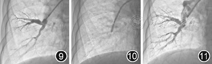 注:图9可见右下肺动脉基底段多发狭窄;图10示球囊扩张狭窄肺动脉;图11球囊扩张后复查发现右下肺动脉血流明显改善,肺静脉回流增多增快
