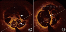 因规范药物治疗效果不佳,建议行PEA手术治疗,但患者考虑PEA术风险大,拒绝接受。建议患者行PTPA术并告知手术风险,患者及家属同意并签署手术同意书。行右心导管检查,具体数据见表1。术前根据术前肺通气/灌注检查结果提示右上肺和双下肺通气灌注缺损明显区域作为治疗部位,送入5F猪尾导管行双下肺野多体位选择性肺动脉造影确定病变血管确定病变部位(图9,图10,图11)。沿导丝送入6F MPD及6F JR3.5指引导管采用子母技术,将指引导管置于靶血管开口,送入贯穿导丝置于血管远端,沿导丝送入C7 Dragonfly OCT图像采集导管行OCT检查,可见管腔内大量网状结构,管腔狭窄(图12)。回撤OCT成像导丝,送入Pressurewire置于血管行压力测定,狭窄近端压力86/14/39 mmHg、狭窄远端压力16/7/11 mmHg,PPR(Pd/Pp):0.25。使用Cordis 3.0×15 mm球囊压力8~12个大气压维持8~10 s于病变部位扩张,扩张后造影血流明显改善,局部肺静脉回流明显增多增快。再次送压力导丝及OCT成像导丝,OCT成像导丝可见网格样结构被撕裂、管腔较前增宽(图13);分别测量压力,狭窄近端压力86/8/34 mmHg、狭窄远端压力33/8/14 mmHg,冠状动脉血流储备分数(fractional flow reserve,FFR)为0.44(图14,图15,图16,图17)。为避免再灌注肺水肿,初次在右上叶和双下叶肺野选择3条血管进行扩张,术毕拔除股静脉鞘管,加压包扎。术程顺利,患者无咯血、恶性心律失常。术后严密观察48 h,未发生灌注肺水肿。术后患者活动后气促症状改善。出院治疗方案为他达拉非10 mg,1次/d,贝前列素钠20 μg,3次/d,利伐沙班20 mg,1次/d。1个月后复查右心导管检查(表1),再次行右上及左下肺动脉球囊扩张(表2)。手术过程同上,术中和术后患者无咯血、无灌注肺水肿发生。术后患者活动后气促症状明显改善,6 min步行距离延长,行肺通气/灌注检查发现治疗后右上肺和左下肺灌注较前改善(图3,图4,图5,图6,图7,图8)。出院治疗方案为他达拉非10 mg,1次/d,利伐沙班20 mg,1次/d。
