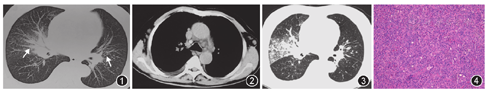 患者为农民,既往健康。体检:体温37.0 ℃,脉搏99次/min,呼吸20次/min,血压133/75 mmHg(1 mmHg=0.133 kPa)。左侧颈部、腋窝可触及数枚花生米大小肿大淋巴结,活动度好,边界清楚,无压痛。皮肤巩膜未见黄染。右下肺呼吸音低,右下肺叩诊呈浊音,双肺未闻及干湿性啰音,心脏及腹部未见异常。入院后血常规示白细胞为6.31×109/L,中性粒细胞为0.57,嗜酸粒细胞为0.17,血红蛋白为118 g/L,血小板为148×1012/L,肝功能、肾功能、电解质均正常,乳酸脱氢酶(lactic dehydrogenase,LDH)为299 U/L,D二聚体正常,ESR为17 mm/1 h,C反应蛋白为30.77 mg/L,降钙素原为0.10 μg/L。PPD阴性,1,3-β-D-葡聚糖(G试验)阴性,半乳甘露聚糖试验(GM试验)阴性,痰涂片抗酸染色阴性3次,痰结核分枝杆菌DNA检测阴性,痰Xpert MTB/RIF未检出结核分枝杆菌核酸,痰真菌涂片阴性,痰真菌培养阴性,痰普通细菌培养阴性,血培养阴性。肿瘤标志物:糖类抗原125为131.20 U/ml,癌胚抗原(CEA)、甲胎蛋白、细胞角蛋白19片段、神经元特异性烯醇化酶、糖类抗原19-9均正常。乙肝表面抗原阴性,丙肝抗体阴性,梅毒抗体阴性,HIV抗体阴性。右侧胸腔积液:李凡他试验阳性,细胞数为1 400×106/L,淋巴细胞为79%,中性粒细胞为21%,总蛋白为34.1 g/L,葡萄糖为6.8 mmol/L,腺苷脱氢酶为19.9 U/L,LDH为179 U/L,细胞学检测可见大量淋巴细胞,未见肿瘤细胞。2018年6月16日复查胸部CT示双肺病变较前有进展(图3)。