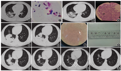 孙民峰(放射科):患者胸部CT初始表现为右肺下叶近胸膜处多发结节,周围可见渗出,表现为"晕圈征",可见于肺炎、结核球、肺癌、隐源性机化性肺炎等疾病,经抗感染治疗后,肺部病灶进展,部分结节相互融合。主要与以下疾病相鉴别:(1)肺炎型肺癌:可呈肺炎影像,本患者短期内变化太快,可能性小;(2)肺结核:病灶好发于双肺上叶尖后段或下叶背段;形态学多样,可表现为实变、空洞、结节。结节样病变多沿气道播散,周围可见树芽征、卫星灶及支气管壁增厚。本例患者以结节晕征为主,无卫星灶,且病灶短期进展,不符合肺结核的病变特征;(3)肺隐球菌病(PC):临床症状无特异度,影像学表现多样,可表现孤立或多个结节、下肺多见,双肺分布粟粒样阴影及片状渗出阴影,非免疫缺陷PC患者可出现临床症状的缺失[2],不能除外;(4)隐源性机化性肺炎(COP):多表现为磨玻璃影及肺泡性浸润影,在病程中,病灶多累及多叶段,常有明显的移动及游走性,好发于胸膜下及肺叶外带。本例患者病灶相对局限,不符合COP的典型表现。建议进一步行肺穿刺活检,协助诊断。