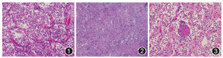 肺内主要病理变化为肺泡腔内多量巨噬细胞、浆液性和浆液纤维素性渗出,伴肺泡腔内出血(图1);肺泡弥漫性损伤;肺泡肉质变;肺实变(图2);部分患者少量肺泡腔面透明膜形成;Ⅱ型肺泡上皮不同程度增生;肺泡间隔不同程度增宽,间质纤维组织增生,可见少量淋巴细胞浸润(图3);部分小气道(主要是细支气管和终末细支气管)黏液性分泌物潴留,甚至黏液栓形成。部分患者继发细菌感染,表现为病灶内以中性粒细胞为主的炎症细胞浸润;少数患者继发真菌感染,表现为病灶内可见真菌菌丝和孢子。以上形态符合病毒性肺炎病理改变,可继发或复合其他病原微生物如细菌、真菌等感染。