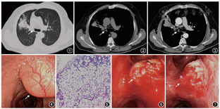因患者胸部CT提示占位性病变,遂行纤维支气管镜以明确病变性质。第1次支气管镜检查见气管通畅,隆突锐利,右肺上叶支气管开口处可见新生物完全阻塞管腔,新生物呈结节状外生性生长,基底部较宽,质地柔软。肿物表面光滑,黏膜充血,可见表面毛细血管增粗、扭曲、扩张。周围黏膜略充血,水肿,软骨环模糊不清,并分布少量黏液性分泌物(图4)。于该部位行新生物活检术,钳检5块病变组织标本送病理检查。送检病理回报:右肺上叶开口支气管黏膜下脂肪组织增生,分化成熟,病变形态符合脂肪瘤(图5)。结合患者各项临床资料,诊断该病变为气管内脂肪瘤。遂行第2次气管镜进行内镜治疗,给予气管镜下电圈套器套取新生物后,利用氩等离子体凝固(APC)烧灼清理残存肿瘤组织,在破坏肿瘤细胞的同时加以止血(图6)。患者术后病情平稳,生命体征稳定,安全返回病房。术后3 d,再次气管镜检查,以清除坏死组织及焦痂,并再次烧灼残存肿瘤,镜下可见右肺上叶呈术后改变,新生物消失,右肺上叶支气管恢复通畅,残留少量损伤黏膜(图7)。入院时因胸部CT提示右肺上叶远端阻塞性肺炎,故住院期间同时给予抗感染治疗(哌拉西林钠舒巴坦钠,5.0 g,2次/d)。患者经内镜介入联合抗感染治疗,5 d后体温恢复正常,病情好转出院。