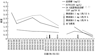 一方面给予抗感染、处理并发症和支持治疗,具体为2019年10月12日起予足量磺胺甲噁唑/甲氧苄啶片,3片 1次/8 h,2019年10月16日改为3片 1次/6 h,2019年10月21日改为3片1次/8 h,后按照肾功能调整剂量至去世。联合卡泊芬净治疗肺孢子菌肺炎(pneumocystis jiroveci pneumonia,PJP)。先后给予莫西沙星、美罗培南、哌拉西林他唑巴坦、万古霉素治疗细菌感染,膦甲酸钠治疗CMV感染。控制血糖,纠正低血钾,治疗消化道出血和双下肌间静脉血栓。2019年10月19日患者继发呼吸机相关肺炎,PCT明显升高,支气管分泌物培养为泛耐药鲍曼不动杆菌,先后给予头孢哌酮舒巴坦、替加环素、多黏菌素B治疗。2019年10月22日因CMV治疗效果不佳调整为更昔洛韦抗病毒。另一方面降低皮质醇水平,奥曲肽逐渐加量至0.2 mg 1次/8 h,后考虑奥曲肽应用后可能存在脱逸现象,加用水飞蓟宾抑制ACTH,此过程中监测血皮质醇下降至40.32 μg/dl,24 h尿游离皮质醇下降至2 285.0 μg/24 h,ACTH下降至46.79 ng/L(图5)。经过上述治疗患者肺部和全身感染仍控制不佳,呈现急性呼吸窘迫综合征,多器官功能衰竭,患者家属拒绝体外膜肺氧合,于2019年10月28日死亡。