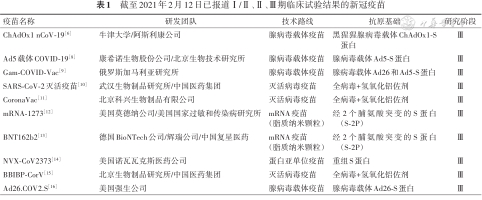 截至2021年2月12日已报道Ⅰ/Ⅱ、Ⅱ、Ⅲ期临床试验结果的新冠疫苗