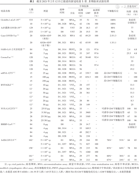 截至2021年2月12日已报道的新冠疫苗Ⅰ/Ⅱ、Ⅱ期临床试验结果