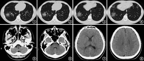 患者入院第6天,自诉嗅觉丧失,伴轻咳,给复方甘草合剂10 ml,3次/d,口服对症治疗,暂观察嗅觉情况。第8天患者仍旧诉嗅觉丧失,请耳鼻喉科会诊,给予甲钴胺0.5 mg,3次/d,口服营养神经,每天自行75%的酒精测试恢复情况,入院第15天患者仍诉嗅觉减退,对症治疗效果欠佳,专家组会诊后考虑不除外病毒侵犯嗅神经,加用维生素B1 10 mg,3次/d,口服对症,行鼻窦CT(图5,6)、头颅CT(图7,8)检查均未见明显异常,再次请耳鼻喉科专家会诊,考虑不除外神经性损害或嗅上皮损害,建议加用牛痘疫苗接种家兔炎症皮肤提取物8 U,2次/d肌肉注射。患者嗅觉有一过性好转,但恢复缓慢,于入院第20、21天行咽拭子新冠病毒核酸检测均为阴性,出院继续观察。出院后5个月电话随访,患者嗅觉于出院后未恢复至发病前状态,仍有轻度嗅觉减退,因未影响日常工作及生活未进行诊治。