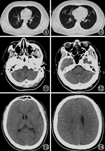 患者入院后第14天出现鼻塞,体温不高,无其他阳性症状。隔日仍有鼻塞,新冠病毒核酸检测回报阳性。入院第19天患者自诉嗅觉减退,追问患者鼻塞症状开始时即出现嗅觉减退,予加用甲钴胺0.5 mg,3次/d,口服营养神经治疗。并请耳鼻喉科会诊,给予维生素B1 10 mg,3次/d,口服、维生素B12 0.1 mg,1次/d,肌肉注射营养神经,每天自行75%的酒精测试恢复情况,副鼻部CT(图11,12)提示左侧上额窦黏膜下囊肿,双侧筛窦黏膜增厚,头颅CT(图13,14)未见明显异常。再次请耳鼻喉专家会诊后,加用牛痘疫苗接种家兔炎症皮肤提取物8 U,2次/d,肌肉注射治疗。入院第24天患者自诉嗅觉较前有所好转,第30天自诉嗅觉恢复。入院第31、32天咽拭子新型冠状病毒核酸阴性,出院观察。出院后电话随访,患者嗅觉于出院后半个月完全恢复正常。后未再出现嗅觉障碍。