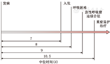 5. 病程发展:重症患者多在发病1~2周内出现呼吸困难和(或) 低氧血症,严重者可快速进展为ARDS、中毒性休克及多器官功能障碍综合征等(图1)。极少数患者还可有中枢神经系统受累。