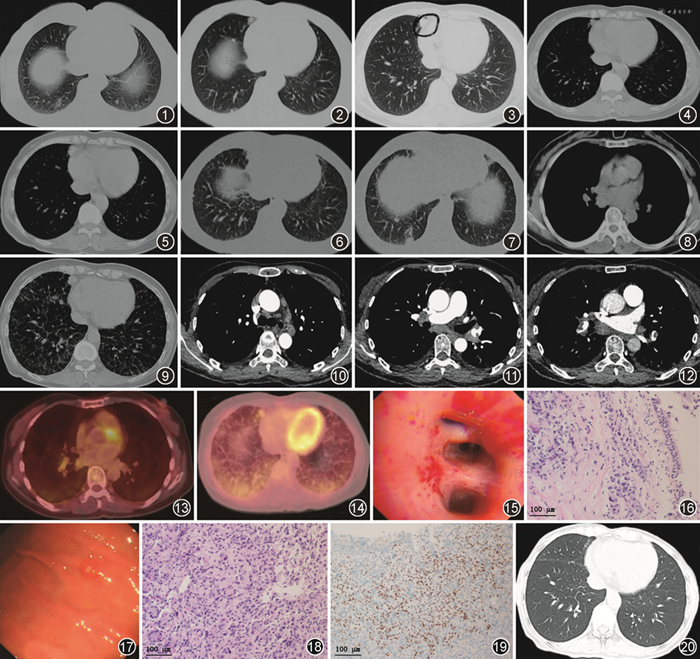 患者女,53岁,主因“发现肺部结节3年余,咳嗽、咳痰伴活动后气短4个月”于2019年9月18日入院。患者3年余前因胸部隐痛行胸部CT发现双肺多发结节影(图1),胸痛与呼吸运动无关,不伴咳嗽、咳痰、咯血、气短,无发热、乏力、盗汗、纳差,无皮疹、紫癜、雷诺现象、猖獗齿,无关节疼痛、肌肉酸痛、下肢浮肿,其后胸痛自行缓解。此后患者无明显不适,每半年至1年复查胸部CT,未见明显变化(图2~5)。4个月前患者无明显诱因出现咳嗽、咳少量黄白痰,伴活动后气短,上4层楼或平路快走后出现,休息后可缓解。无发热、胸痛、咯血,无下肢浮肿、夜间阵发性呼吸困难,复查胸部CT提示双肺结节影较前增多伴双肺间质性改变(图6~8),曾自服止咳、祛痰等药物对症治疗无明显效果,仍有咳嗽、咳痰,活动后气短逐渐加重。10 d前行胸部增强CT显示双肺多发结节,双肺弥漫性病变,双肺门及纵隔淋巴结增大(图9)。为进一步诊治收入院。患者自发病来,精神、饮食可,二便正常,夜间睡眠可,近半年来体重下降约5 kg。