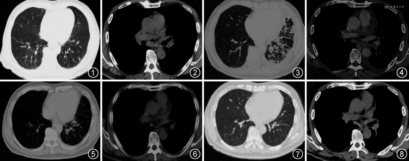 患者男,66岁,主因“反复咳嗽18个月”于2020年11月1日入院。患者2019年5月出现阵发性干咳,PET-CT(图1,2)提示左肺下叶前内基底段病灶,双侧肺门、纵隔、右侧锁骨上窝、肝门区、腹膜后多发淋巴结肿大。2019年9月外院胸膜病理提示多灶性肉芽肿性病变,可见中央坏死,周围可见上皮细胞及多核巨细胞,2次抗酸(+),六胺银(-),倾向结核;纵隔淋巴结病理为肉芽肿性炎,倾向结核。诊断为肺结核合并淋巴结结核,给予利福平(0.45 g,1次/d)、异烟肼(0.3 g,1次/d)、吡嗪酰胺(1.5 g,1次/d)、乙胺丁醇(0.75 g,1次/d)规律治疗9个月后,患者症状无改善,复查胸部增强CT(图3,4)可见左肺多发结节、斑片状密度增高影,左侧少量胸腔积液,双肺门、纵隔淋巴结增大并融合。2020年6月气管镜肺活检组织病原体宏基因组高通量测序(metagenomics next-generation sequencing,mNGS)提示结核分枝杆菌复合群(序列数19),奥布分枝杆菌(序列数302),星形诺卡菌(序列数64),病理未见明确肉芽肿病变及肿瘤。结合肺组织mNGS找到诺卡菌,外院考虑播散性诺卡菌感染可能,给予磺胺甲噁唑/甲氧苄啶(1.2 g,4次/d)、利奈唑胺(0.6 g,2次/d)治疗。2020年7月颈淋巴结培养提示马尔尼菲篮状菌(+),病理示淋巴结肉芽肿性炎。2020年10月复查胸部CT(图5,6)可见左肺及右肺下叶散在结节状高密度灶,左侧胸腔积液较前减少,双侧腋下、左肺门及纵隔淋巴结肿大较前略缩小。考虑患者肺部病变较前吸收,但淋巴结肿大较前改善不明显,于2020年11月1日再次收住我院呼吸与危重症医学科。