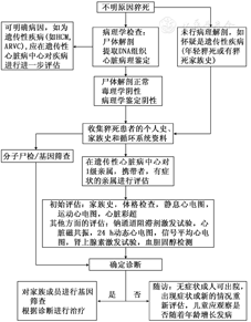 不明原因SCD的诊断理论上首先取决于尸检和毒理学检查,以排除非心脏性病因。然后必须进行心脏病理学及详细的组织病理学检查以排除SCD的明确病因。通过病理学检查可以确定遗传性结构性心脏病如肥厚型心肌病,遗传性结构性心脏病应评估家族成员。留取合适的组织,用于DNA提取和目的基因检测。最好在有遗传学背景的心脏病学专家的支持下进行,以便提高诊断的准确率及指导家族成员的评估。在不少病例中,将病理学检查结果作为死亡原因有些模棱两可,比如:无组织学改变的特发性左心室肥厚,主动脉瓣二瓣化畸形,或无心肌缺血证据的冠状动脉异常。这些仍要视为原因不明,因为对其家族的评估仍可发现相当数量的心律失常综合征。因此,对死亡原因仍然不明者,应进行更细致的研究。收集死前病史或心脏检查结果可能提供一些线索,但死前心电图正常并不能排除心脏遗传性疾病,尤其是家族中有被诊断为Brugada综合征的患者。分子尸检-基因检测可使35%的病例获得明确诊断。这对明确SUDI的死亡原因也有益,因为在死后的基因检测中,估计有10%的SIDS心脏离子通道病基因发生了突变。