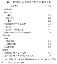 LQTS诊断标准的建议:(1)具备以下1种或多种情况,可明确诊断:①无QT间期延长的继发性因素、Schwartz诊断评分≥3.5分(表1[13])。②存在明确的至少1个基因的致病突变。③无QT间期延长的继发性原因,12导联心电图QTc≥500 ms。(2)以下情况可以诊断:有不明原因晕厥、无QT间期延长的继发原因、未发现致病性基因突变、12导联心电图QTc在480~499 ms。