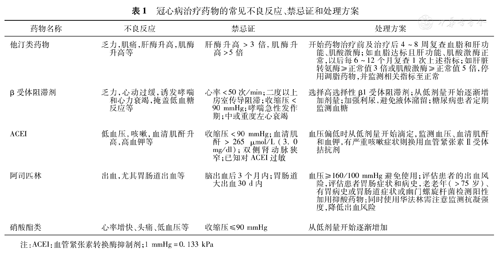 冠心病治疗药物的常见不良反应、禁忌证和处理方案见表1。